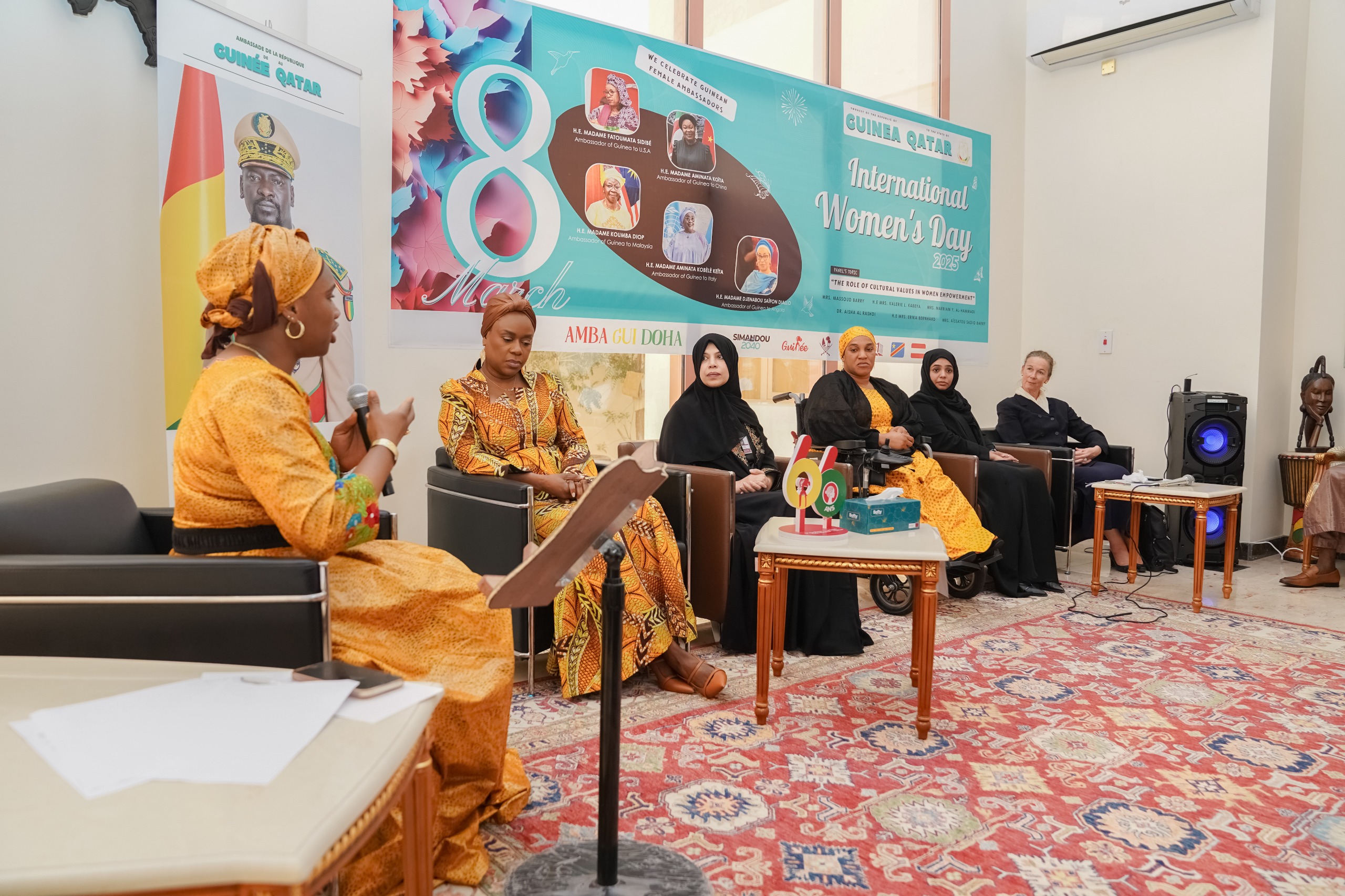 DOHA- L’Ambassade de la République de Guinée au Qatar a célébré la Journée Internationale des Droits des Femmes le dimanche, 09 mars 2025, à sa Chancellerie, à travers un panel de discussion de haut niveau sous le thème : « Le rôle des valeurs culturelles dans l’autonomisation des femmes ». Ledit panel était composé de Madame Massoud BARRY, Vice-Présidente de la Commission Santé, Éducation, Affaires Sociales et Culturelles au Conseil National de la Transition (CNT) de la République de Guinée, Son Excellence Madame Valérie KABEYA, Ambassadeur de la R.D.C au Qatar, Son Excellence Madame Erika BERNHARD, Ambassadeur de l’Autriche au Qatar, Madame Maryam AL-HAMMADI, Directrice de la Coopération Internationale du Ministère de la Culture du Qatar, Dr Aisha AL-RASHDI, Professeur à l’Université du Qatar, et Madame Aïssatou Sadio BARRY, Deuxième Secrétaire à l’Ambassade de Guinée (Modératrice).