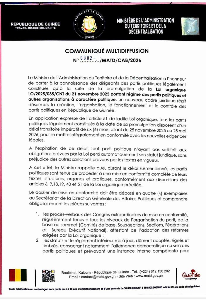 En Guinée, le compte à rebours est lancé pour les partis politiques. Le ministère de l’Administration du territoire et de la Décentralisation leur accorde jusqu’au 25 mai 2026 pour se conformer aux dispositions de la loi organique L 2025-035-CNT du 21 novembre 2025.