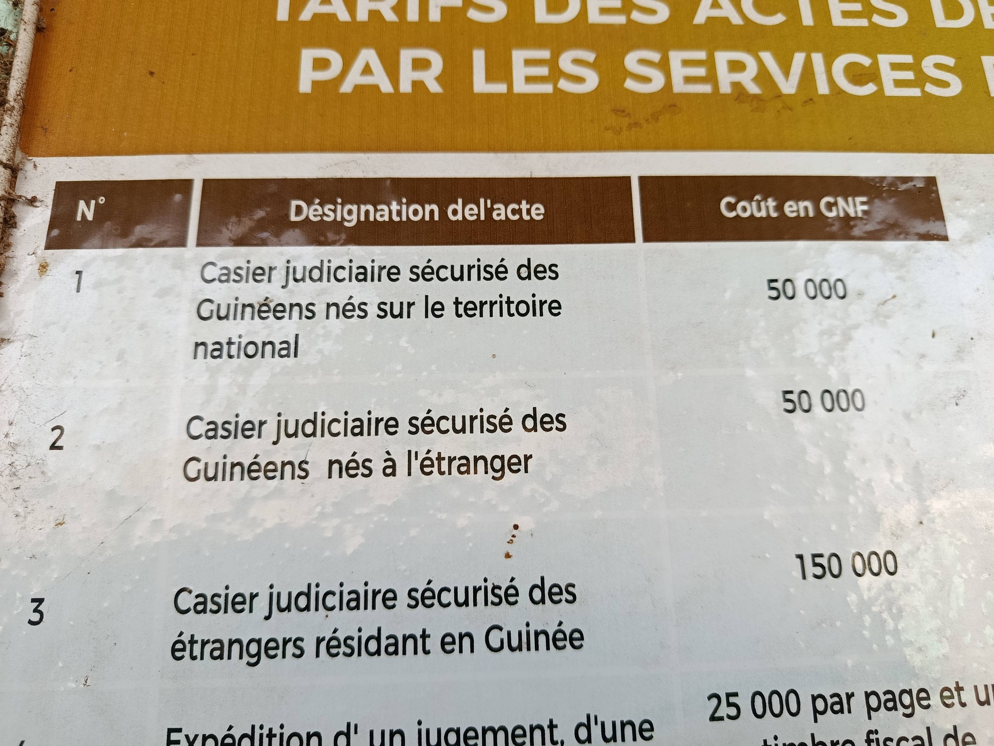 Ainsi, pour obtenir un casier judiciaire, un Guinéen né sur le territoire national devrait théoriquement s’acquitter de 50 000 GNF. Or, dans certaines juridictions, le montant exigé atteint 70 000 GNF. La situation est encore plus préoccupante pour les Guinéens nés à l’étranger : au lieu des 50 000 GNF prévus par la loi, ils doivent désormais payer 150 000 GNF pour obtenir ce document, délivré uniquement par la Direction du Casier Central.