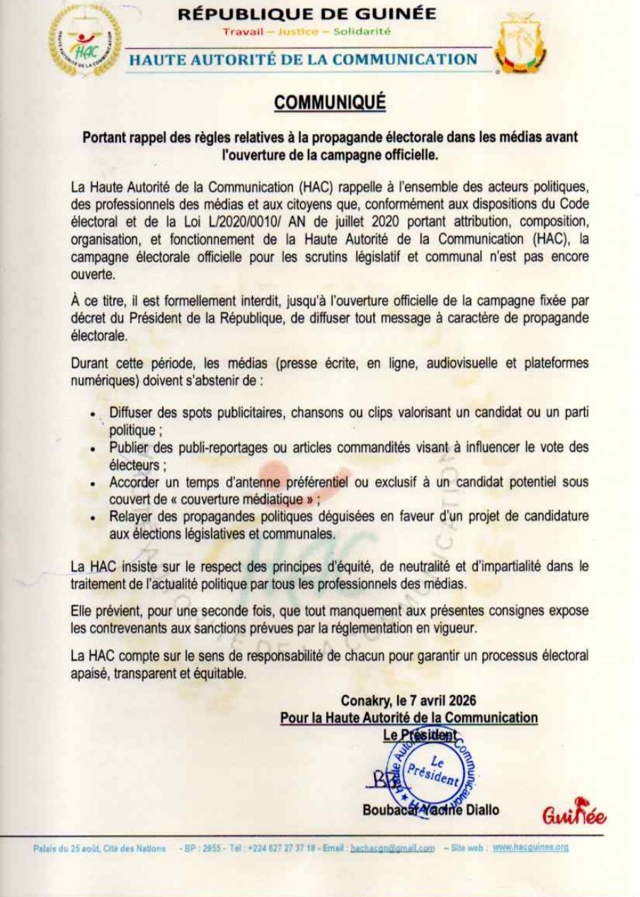À l’approche des élections législatives et communales, la Haute Autorité de la Communication (HAC) rappelle, dans un communiqué publié ce mardi après-midi, que toute diffusion de messages électoraux avant le lancement officiel de la campagne est strictement interdite, conformément au Code électoral et à la loi L/2020/0010/AN de juillet 2020.