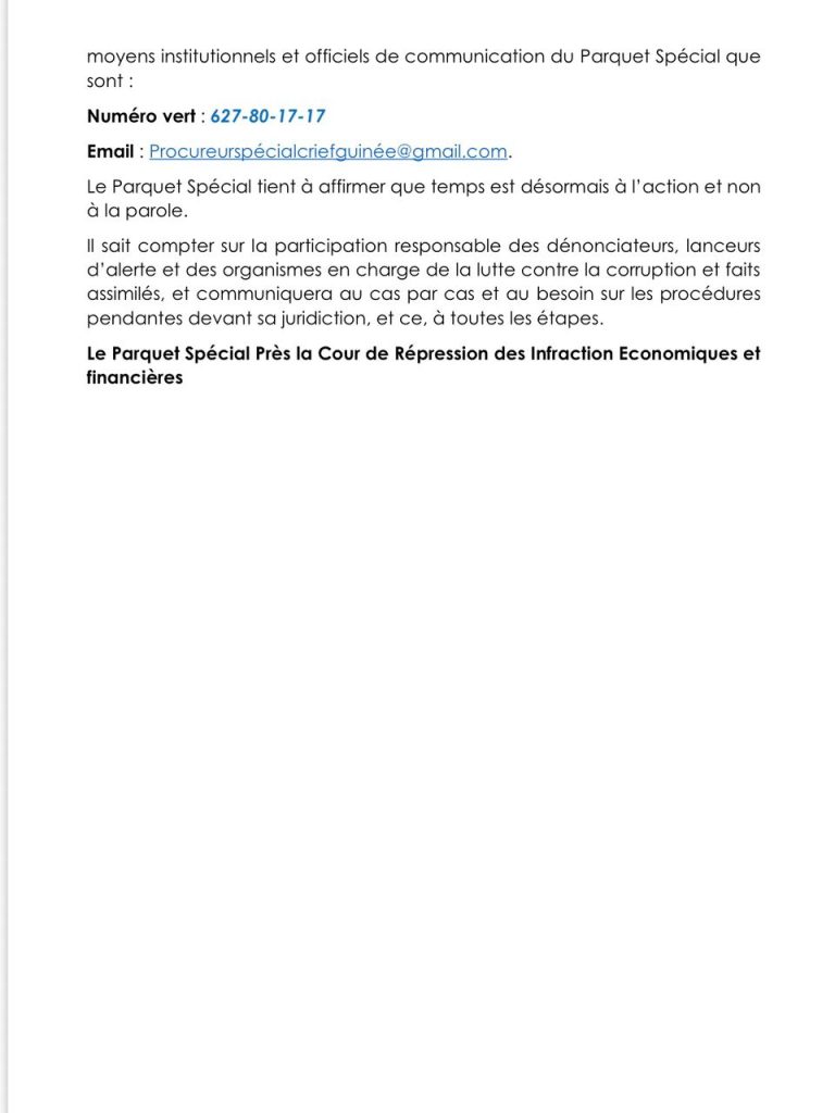 Il rappelle son attachement au respect de la présomption d’innocence ainsi qu’au secret de l’enquête, conformément aux lois en vigueur sur la lutte contre la corruption et le blanchiment de capitaux en Guinée.