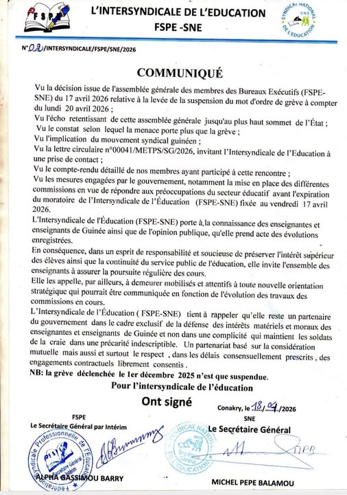 L’Intersyndicale de l’Éducation (FSPE-SNE), qui envisageait de lancer une nouvelle grève à partir du lundi 20 avril 2026 en raison des préoccupations liées à la situation des enseignants, a finalement annoncé la suspension de son mouvement social. La décision a été rendue publique à travers un communiqué publié ce samedi 18 avril 2026.